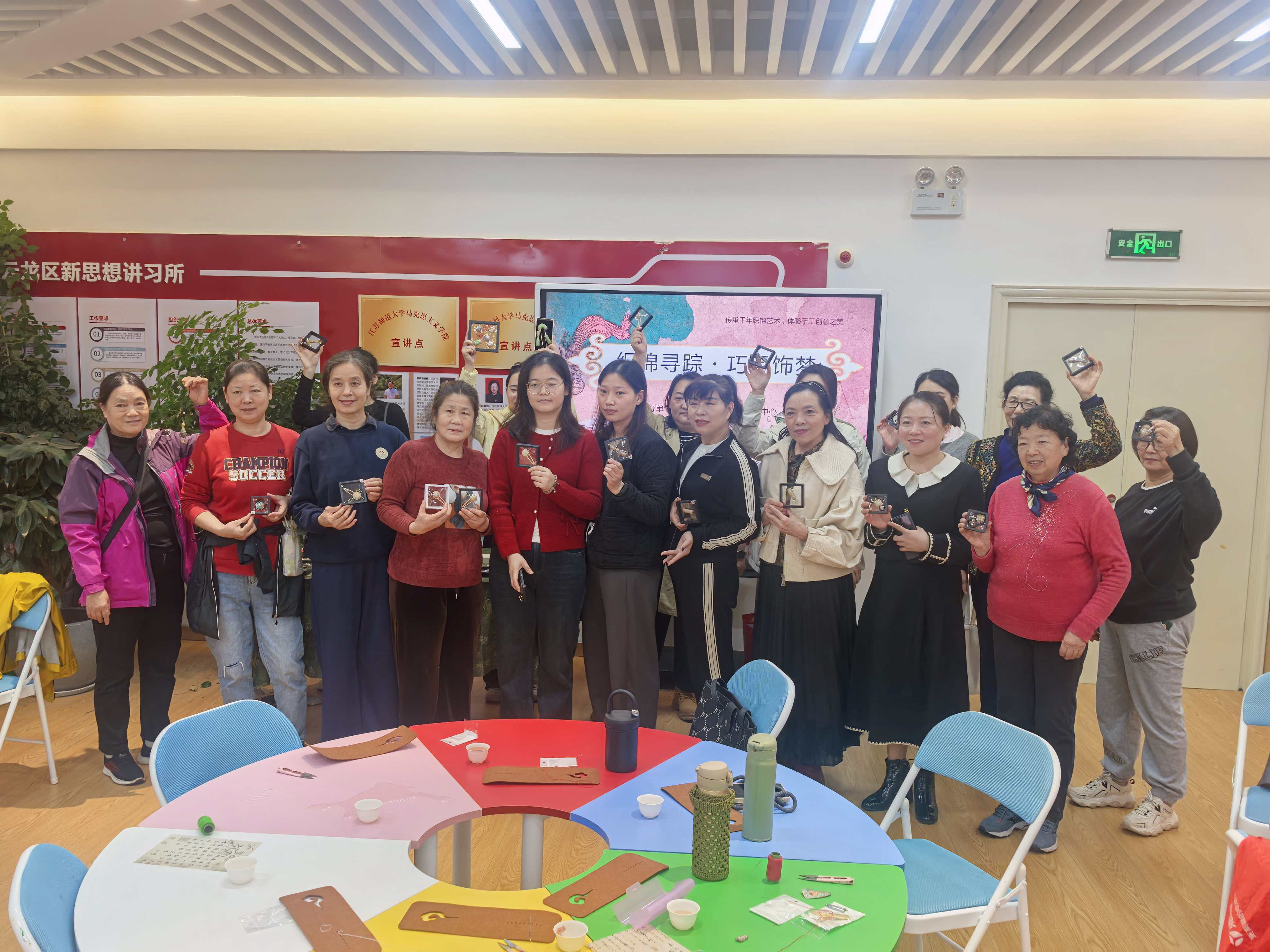 活动尾声的作品展示与分享环节温馨动人。多位居民主动走上台,举起自己亲手制作的宋锦发饰,分享创作过程中的小插曲与心得:“第一次接触宋锦,没想到这么有质感,跟着步骤做下来特别有意义”“通过这次活动,才知道宋锦是这么珍贵的非遗,以后会更关注传统工艺”。每一位分享者都获得了专属小礼品,现场掌声不断。随后,全体参与者与自己的作品合影留念,相机定格下一张张笑脸,也留住了这场非遗体验活动的美好记忆。