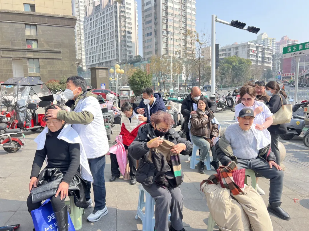 “银龄”关爱服务区暖意融融,志愿者运用揉、按、推、捏、穴位按压等专业手法,为老年群体提供个性化理疗服务,娴熟手法让群众倍感舒适、连连称赞;义务理发摊位上,志愿者一边细致为老人修剪发型,一边拉着家常,用贴心举动传递邻里温情。