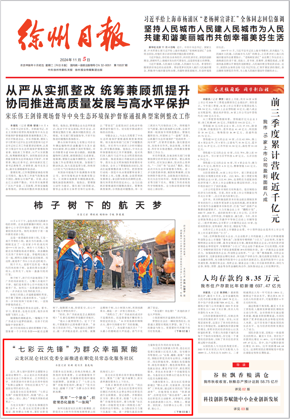 近日,《徐州日报》在头版刊发《“七彩云先锋”为群众幸福聚能》报道我区汉风街道昆仑社区党委全面推进在职党员常态化服务社区依托“七彩云先锋”功能型党组织构建“舒心、