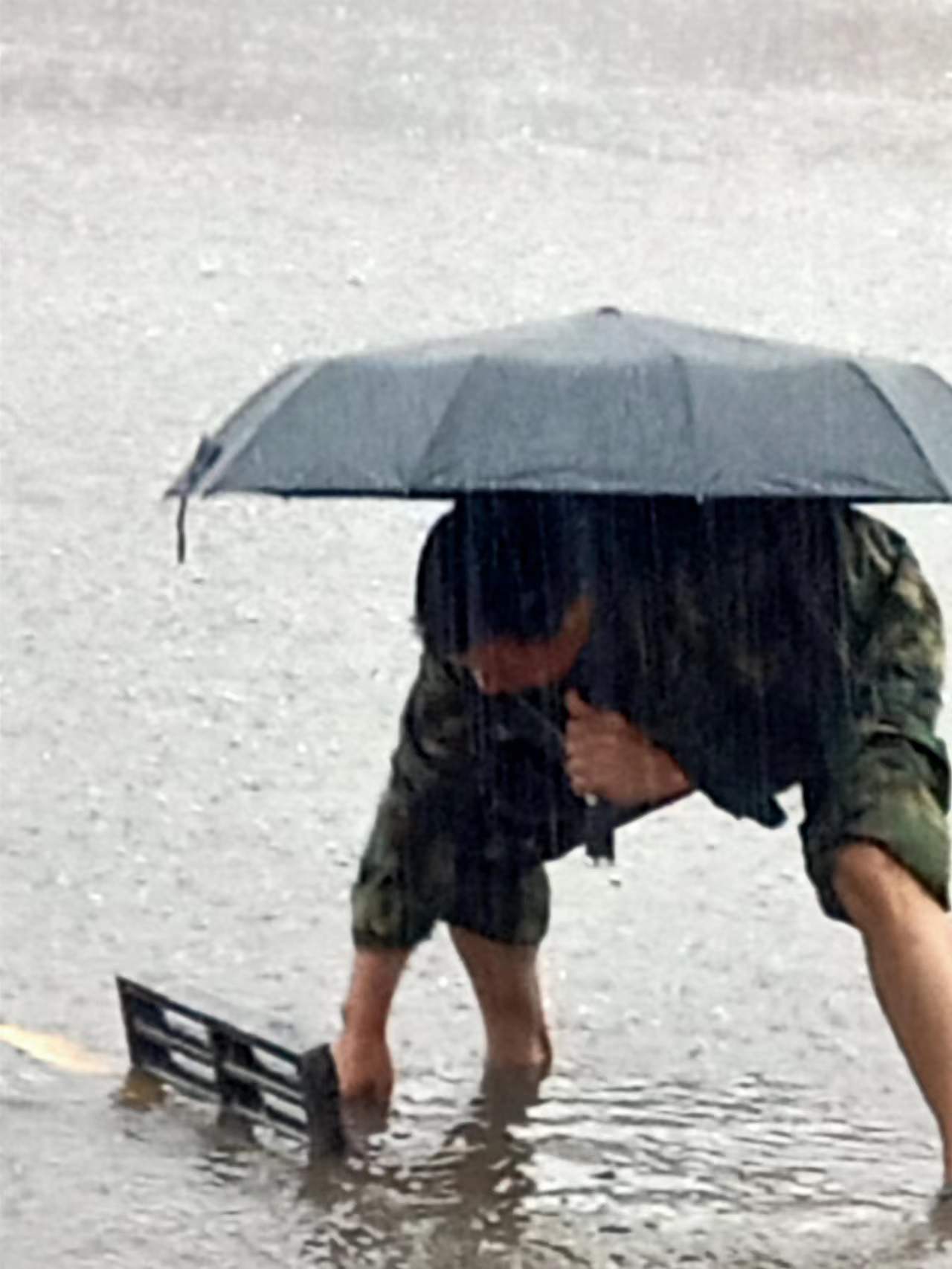 工业园区,金骆驼社区新时代文明实践站志愿者陈浩、吴敏等人掀开雨水井盖、加快排水、并在雨中值守。