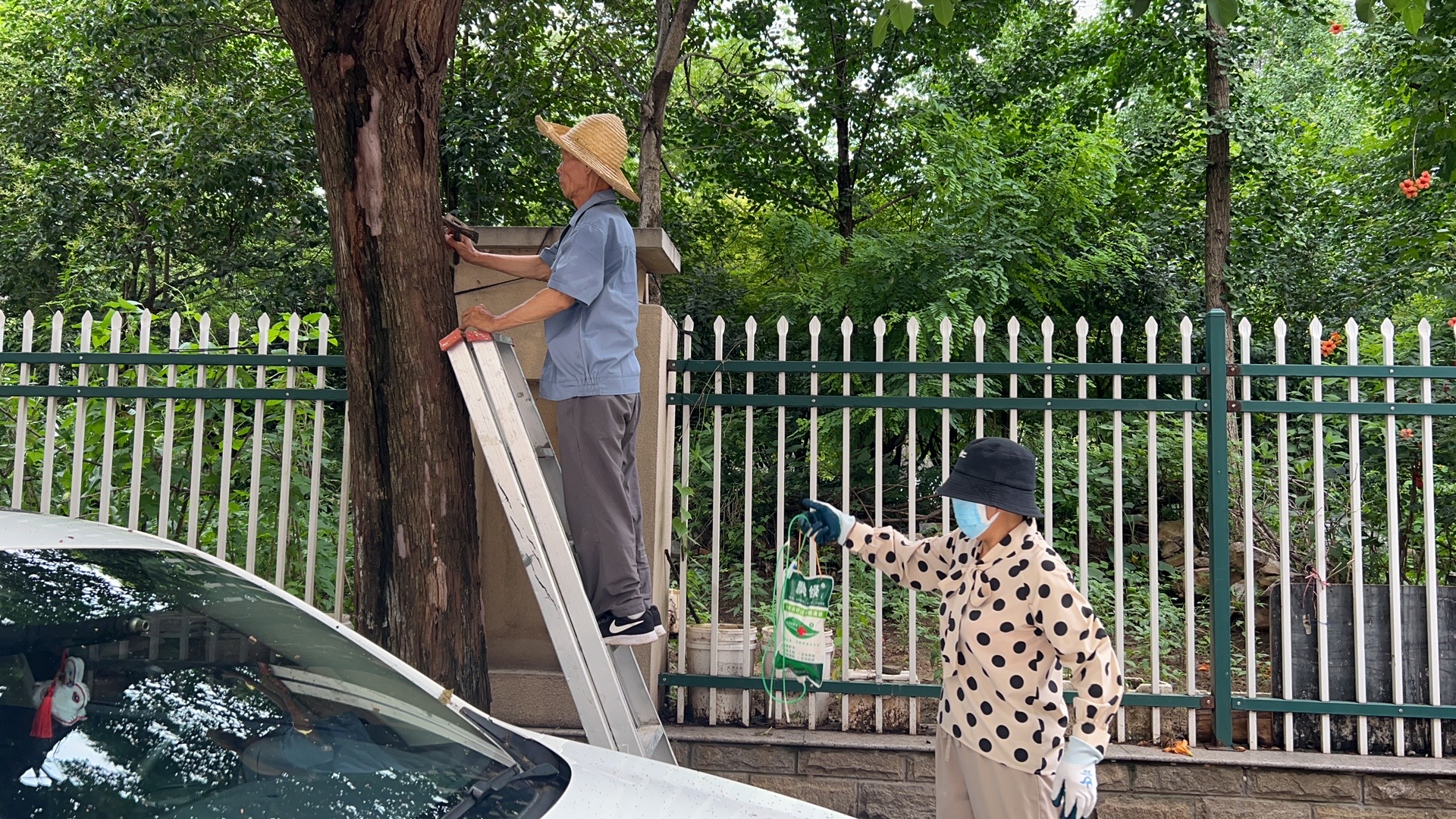 随着气温持续升高,为更好地巩固重阳木锦斑蛾等病虫害的防治效果,在园林局的专业指导下,2023年7月10日至12日,金骆驼社区联合物业给小区重阳木挂上药袋进行“输液”杀虫,社区工作人员、志愿者和物业工作人员一起配药,连续三天在高温酷暑下为大树“输液”。