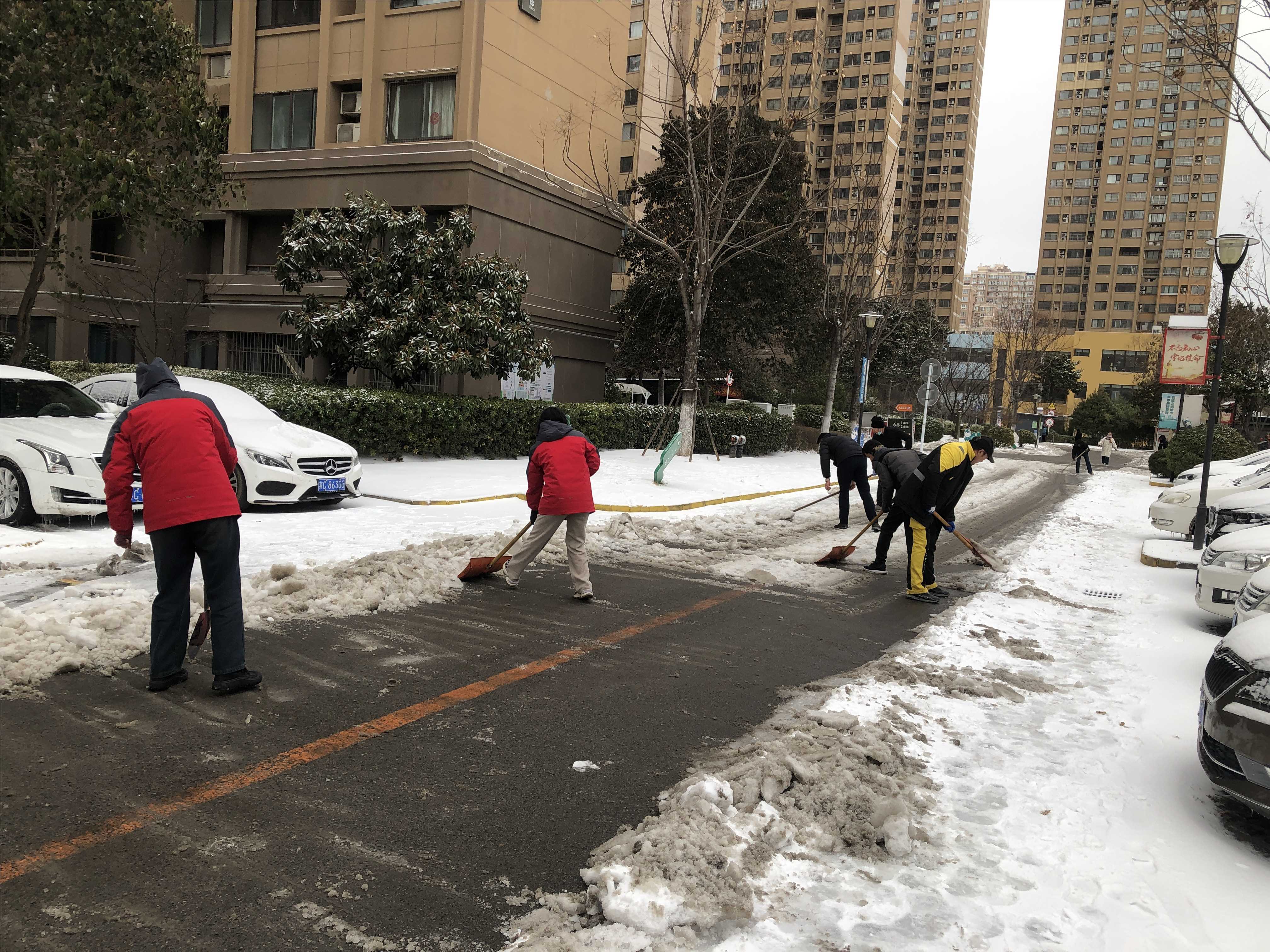 社区工作人员对周边商铺挨家挨户做动员,倡议他们对商铺门前、附近便道进行清理。社区工作人员走进各小区,带领物业、党员、志愿者们一起行动。天气寒冷,大家躬着身子,握着扫把铁锹,哈着白气一铲一扫的把雪扔到路的两旁,道路上演奏着“咣咣咔咔嚓嚓”的扫雪铲雪“进行曲”。