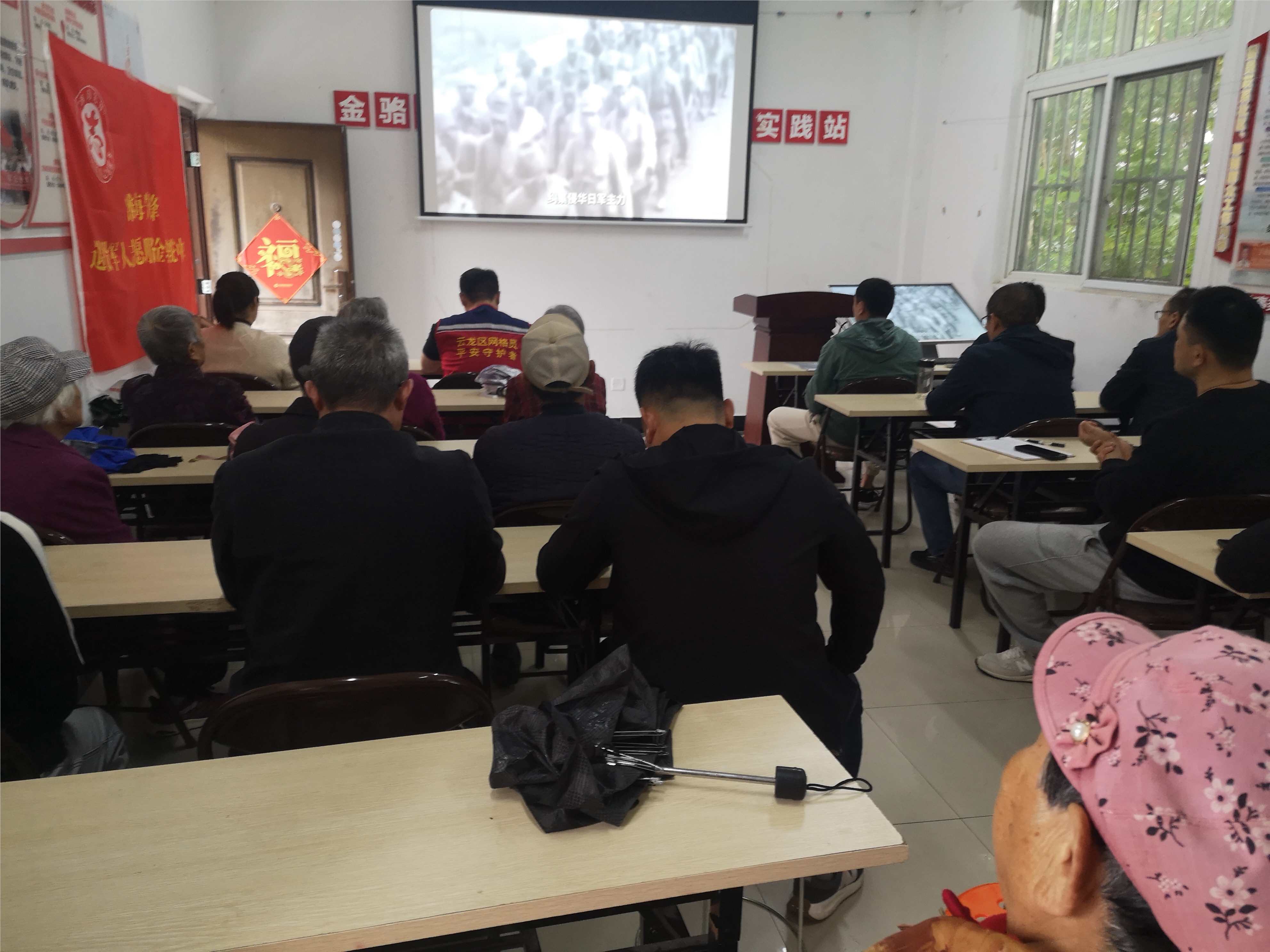 2025年10月15日下午2点30,金骆驼社区组织党员群众观看《八秩荣光——江苏抗日根据地共产党人》之“共产党人好榜样——彭雪枫”。
